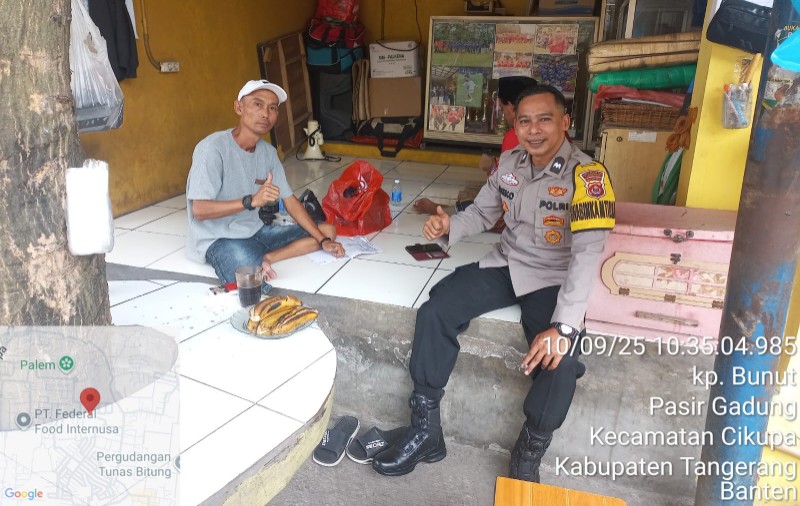 Tangerang | Penatipikor.com – Dalam upaya mempererat kedekatan dengan masyarakat sekaligus menjaga kondusivitas wilayah, Bhabinkamtibmas Desa Pasir Gadung Polsek Cikupa, Aipda Dieko A, melaksanakan kegiatan sambang ke rumah Ketua RT 01/02, Mario, di Kampung Bunut, Desa Pasir Gadung, Kecamatan Cikupa, Kabupaten Tangerang, Rabu (10/9/2025) pukul 10.40 WIB.