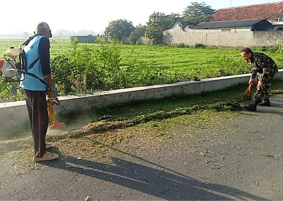 Terlihat Sertu Slamet terjun langsung ke lapangan bersama puluhan warga setempat untuk membersihkan bahu jalan dari rumput liar, sampah plastik, serta merapikan saluran air yang tersumbat.
