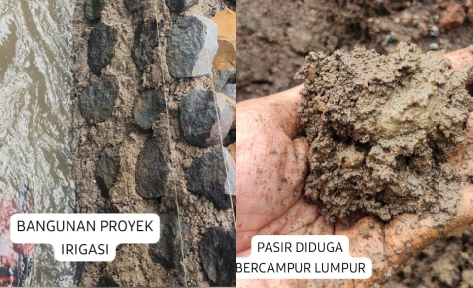 3. Terlihat bangunan irigasi yang sudah jadi berwarna coklat, di duga campuran semennya sangat sedikit dan di dominasi pasir bercampur tanah (lumpur)