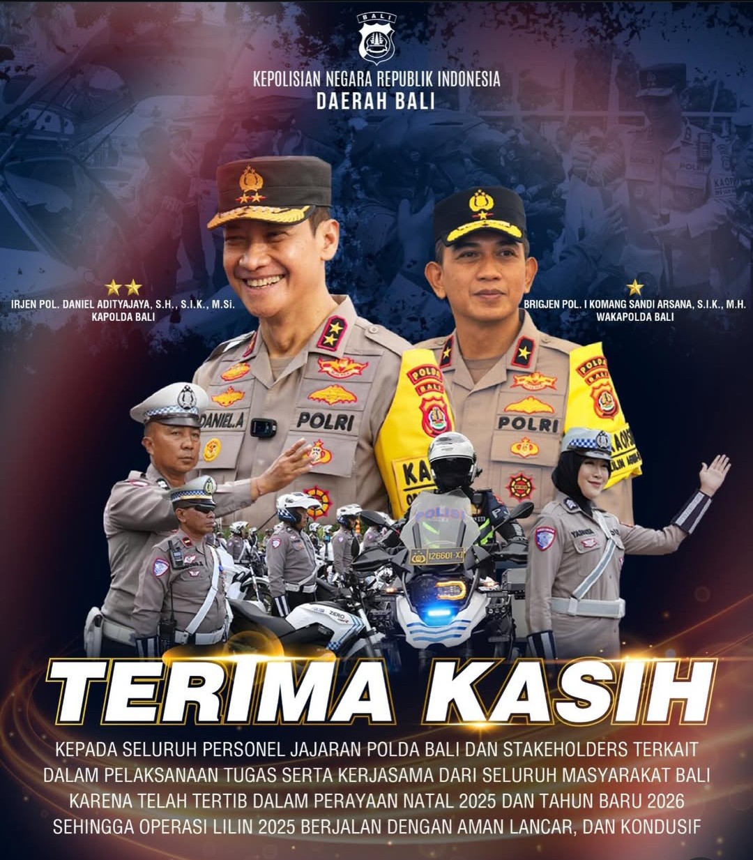 PENATIPIKOR.COM | DENPASAR-BALI, Kepala Kepolisian Daerah Bali, Irjen Pol. Daniel Adityajaya, S.H., S.I.K., M.Si., menyampaikan apresiasi setinggi-tingginya atas kerja keras, dedikasi, dan semangat pengabdian seluruh personel Polda Bali dalam pelaksanaan pengamanan Natal 2025 dan Tahun Baru 2026. Pengamanan yang dilaksanakan dalam kerangka Operasi Lilin 2025 berjalan dengan aman, tertib, dan kondusif berkat sinergi yang kuat antara Polda Bali, stake-holder terkait, serta dukungan aktif masyarakat Bali.