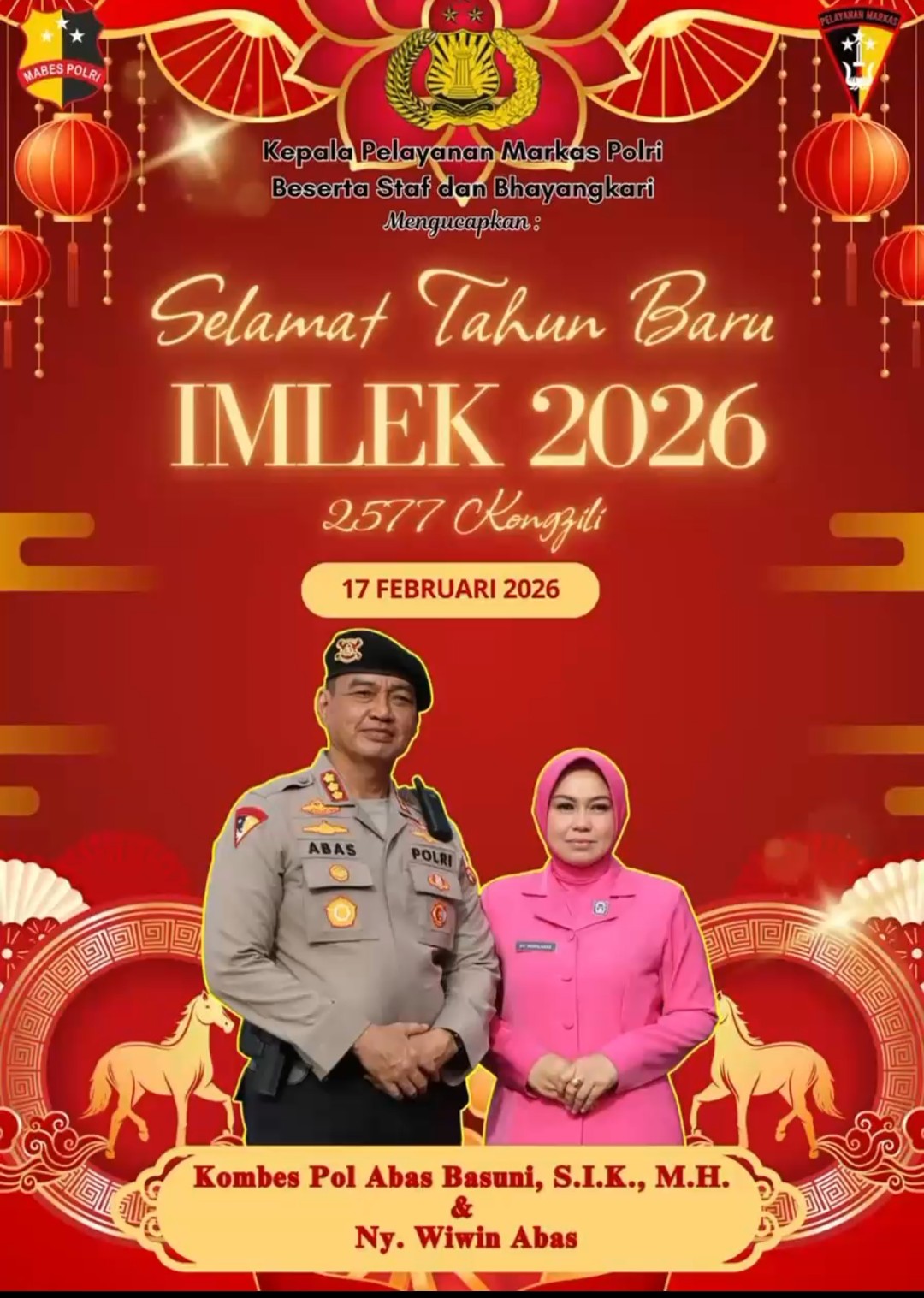 Penatipikor.com | JAKARTA, Dalam semangat Tahun Baru Imlek 2026, Abas Basuni selaku Kepala Pelayanan Markas Mabes Polri Kombes Pol. Abas Basuni, S.I.K., M.H. bersama Ny. Wiwin Abas dan seluruh staf Pelayanan Markas menyampaikan ucapan Selamat Tahun Baru Imlek 2577 Kongzili kepada seluruh masyarakat yang merayakan.