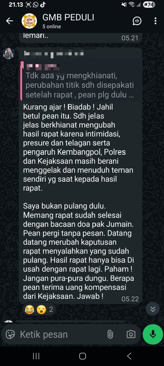 Dalam percakapan tersebut, MM menuding aktivis berinisial S, J, dan H telah mendapatkan intimidasi, tekanan, hingga pengondisian dari sejumlah instansi tersebut. Bahkan, MM secara terbuka menuliskan kalimat bernada provokatif, “Berapa pean terima kompensasi dari Kejaksaan, jawab,” yang langsung memicu kemarahan.