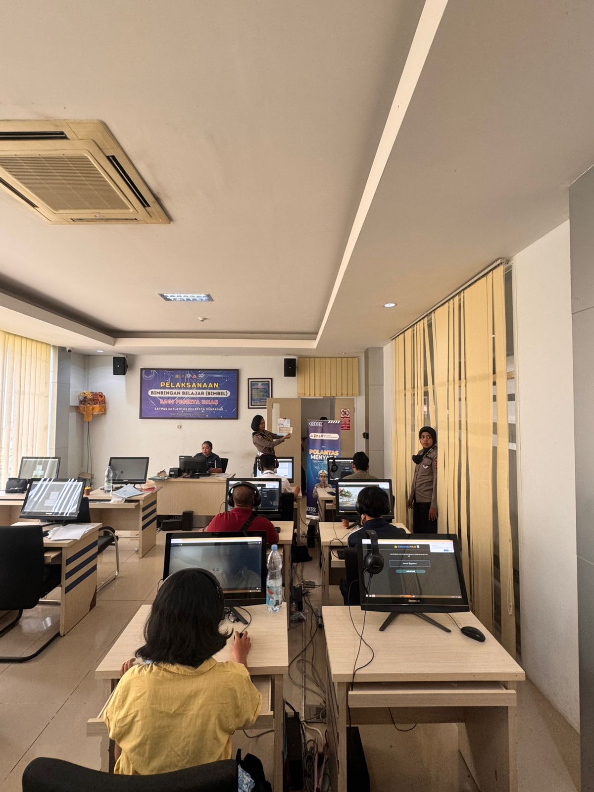 Kegiatan ini dilaksanakan di ruang ujian teori Satpas SIM Polresta Denpasar dan diikuti oleh para pemohon SIM yang sedang menjalani proses pembuatan maupun perpanjangan SIM. Dalam kegiatan tersebut, petugas memberikan arahan terkait materi ujian teori, cara menjawab soal, serta pemahaman mengenai rambu-rambu lalu lintas dan etika berkendara yang aman di jalan raya.