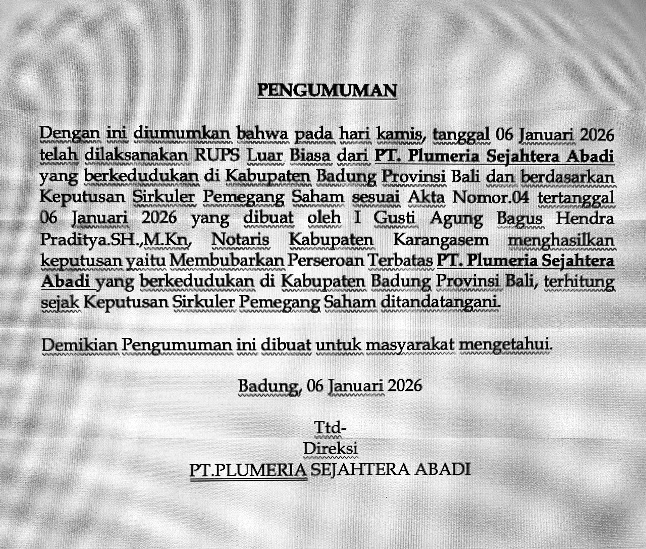 Dengan ini diumumkan bahwa pada hari Kamis, tanggal 06 Januari 2026 telah dilaksanakan RUPS Luar Biasa dari PT. Plumeria Sejahtera Abadi yang berkedudukan di Kabupaten Badung Provinsi Bali dan berdasarkan Keputusan Sirkuler Pemegang Saham sesuai Akta Nomor.04 tertanggal 06 Januari 2026 yang dibuat oleh I Gusti Agung Bagus Hendra Praditya, SH.,M.,Kn., Notaris Kabupaten Karangasem menghasilkan keputusan yaitu Membubarkan Perseroan Terbatas PT. Plumeria Sejahtera Abadi yang berkedudukan di Kabupaten Badung Provinsi Bali, terhitung sejak Keputusan Sirkuler Pemegang Saham ditandatangani. Demikian Pengumuman ini dibuat untuk masyarakat mengetahui.
