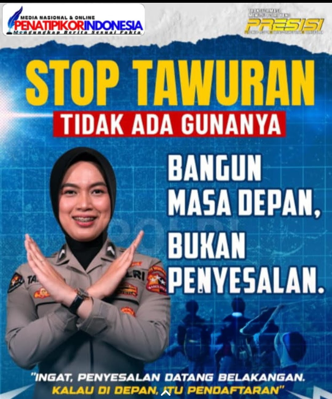 Sebagai penutup, Polri mengimbau seluruh generasi muda untuk fokus pada hal-hal yang membangun dan bermanfaat. Bangun masa depan dengan prestasi, bukan dengan penyesalan. Jaga diri, jaga teman, dan jaga masa depan bersama demi terwujudnya Indonesia yang aman, damai, dan berkeadaban.