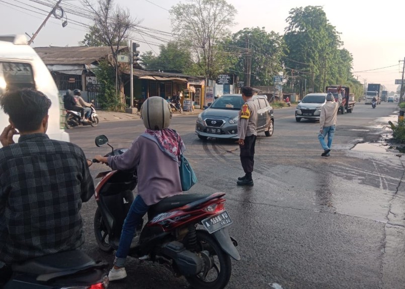 Anggota Polsek Balaraja melakukan pengaturan lalu lintas untuk membantu kelancaran kendaraan masyarakat yang lalu lalang untuk beraktifitas di Wilayah Kecamatan Balaraja.